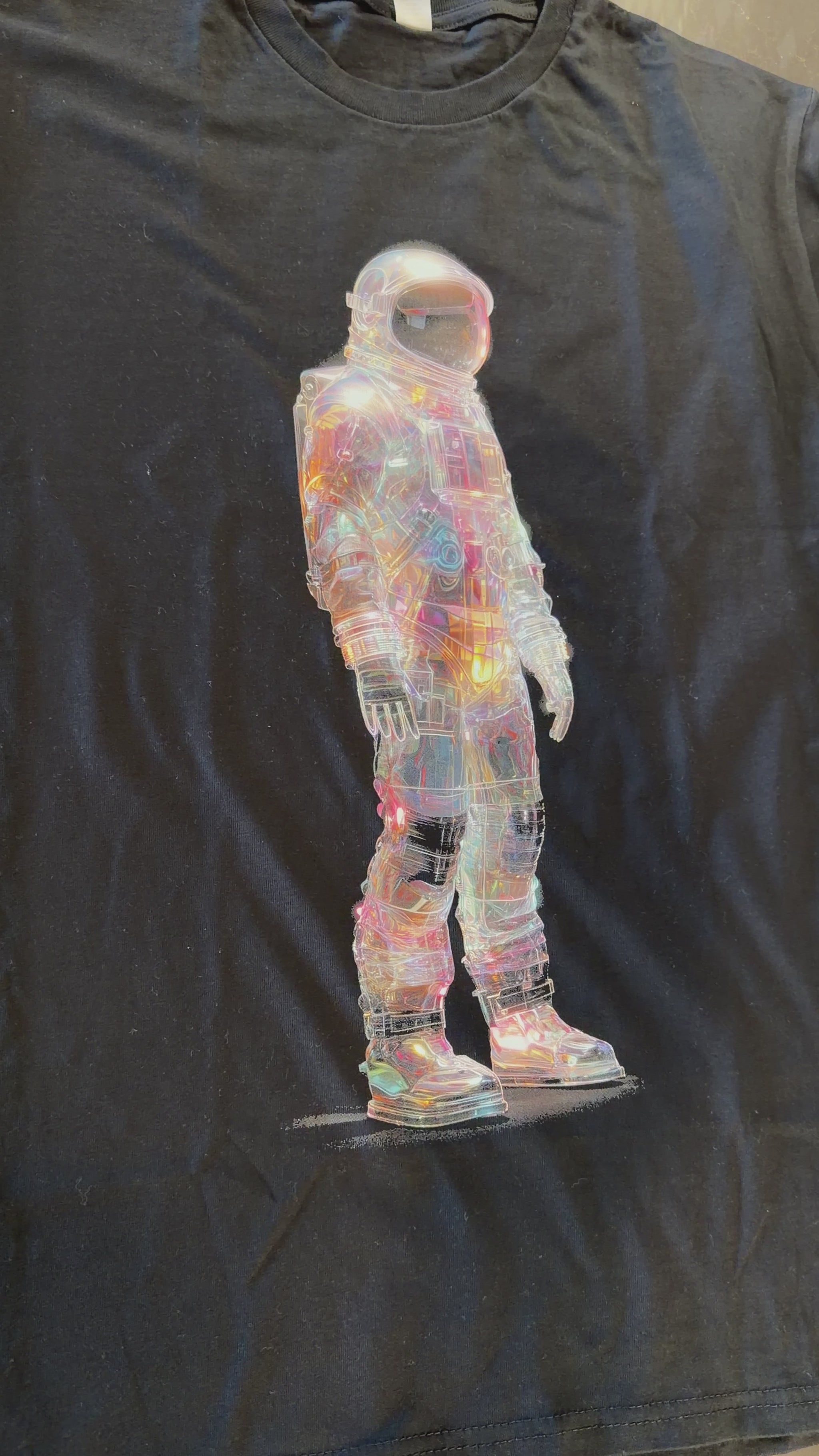 I am only creating 100 of these shirts into 2026. The SP@C3M@N (Spaceman) design. When this design was in development and I showed it to my friends, it got the strongest reaction. Because it is so striking with the iridescent colors and unique knockout approach.